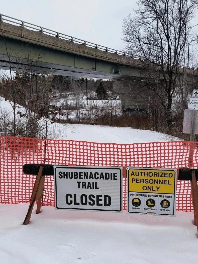 Feb 1, 2026 - Trail is marked closed at the HIghway 107 overpass. There is no way around and users are to turn back the way they came. Demolition of the pedestrian bridge over the Shubenacadie Canal to Waverley Rd has begun.