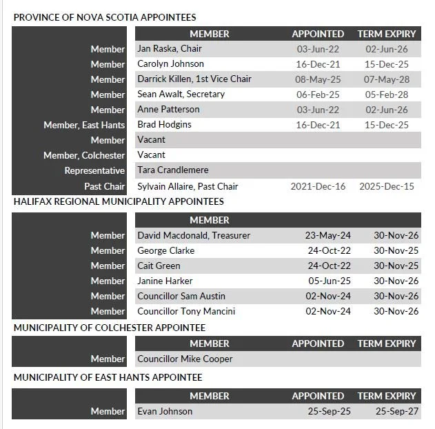 Our volunteer board members are appointed by the Province of Nova Scotia, Halifax Regional Municipality, the Municipality of Colchester, and the Municipality of East Hants, as listed below.