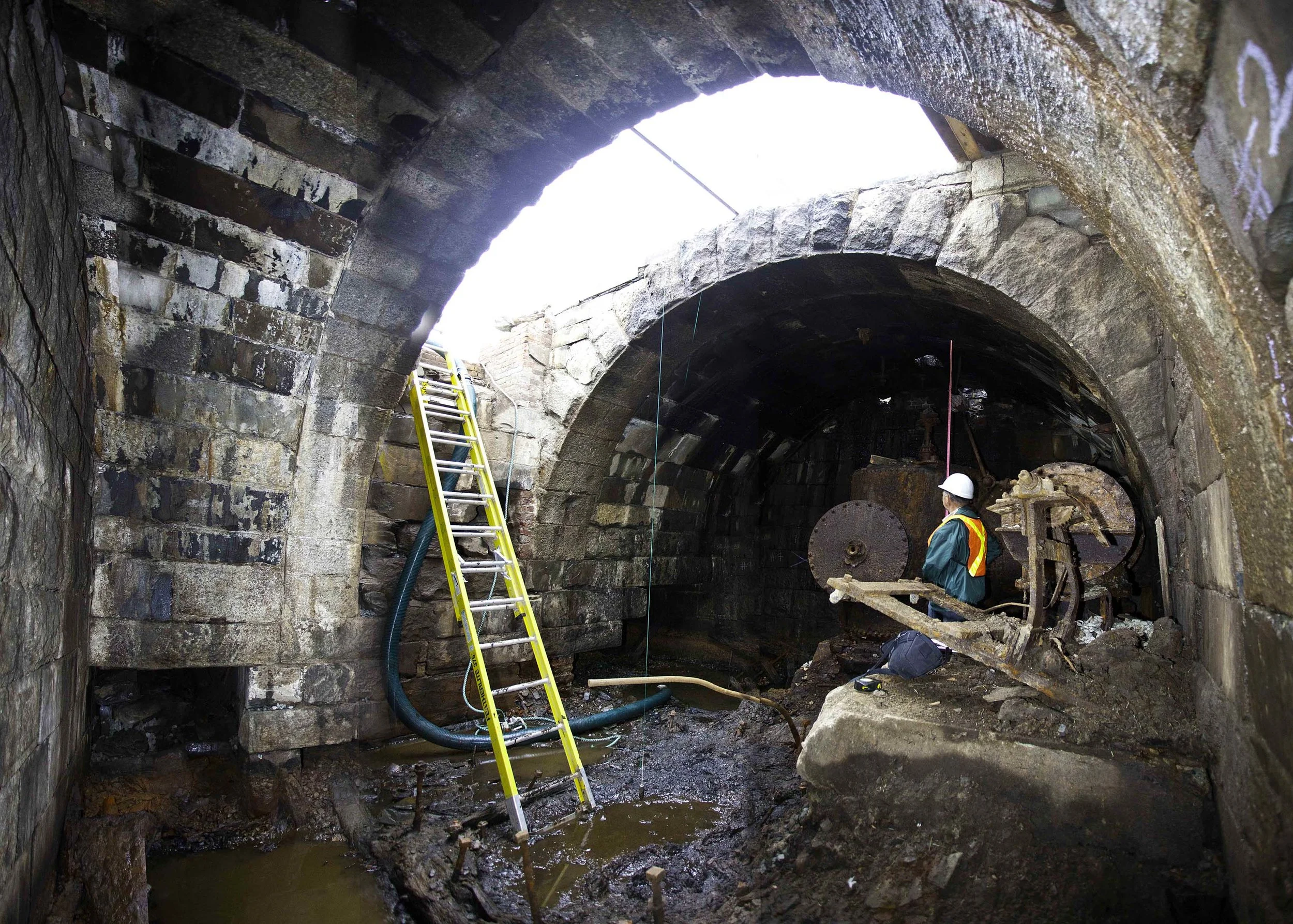 The Ladder is leaning against the South wall of the turbine chamber. The East and West walls are from the original Lock #3.